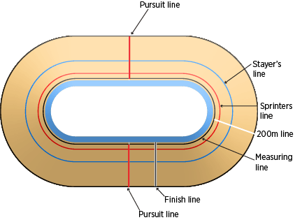 It represents the official length of the velodrome and is where training efforts and races take place. - Red line (sprinter’s lane)